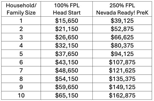 Los programas Head Start en Nevada se gestionan de forma individual mediante subvenciones federales directas. El gobierno federal establece los criterios de elegibilidad que los programas deben seguir, pero ofrecen flexibilidad para ayudar a satisfacer las necesidades individuales de las familias. Generalmente, los niños son elegibles para Head Start si cumplen los siguientes criterios: