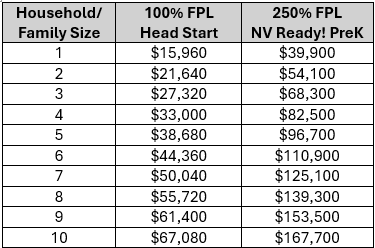 Los programas Head Start en Nevada se gestionan de forma individual mediante subvenciones federales directas. El gobierno federal establece los criterios de elegibilidad que los programas deben seguir, pero ofrecen flexibilidad para ayudar a satisfacer las necesidades individuales de las familias. Generalmente, los niños son elegibles para Head Start si cumplen los siguientes criterios: